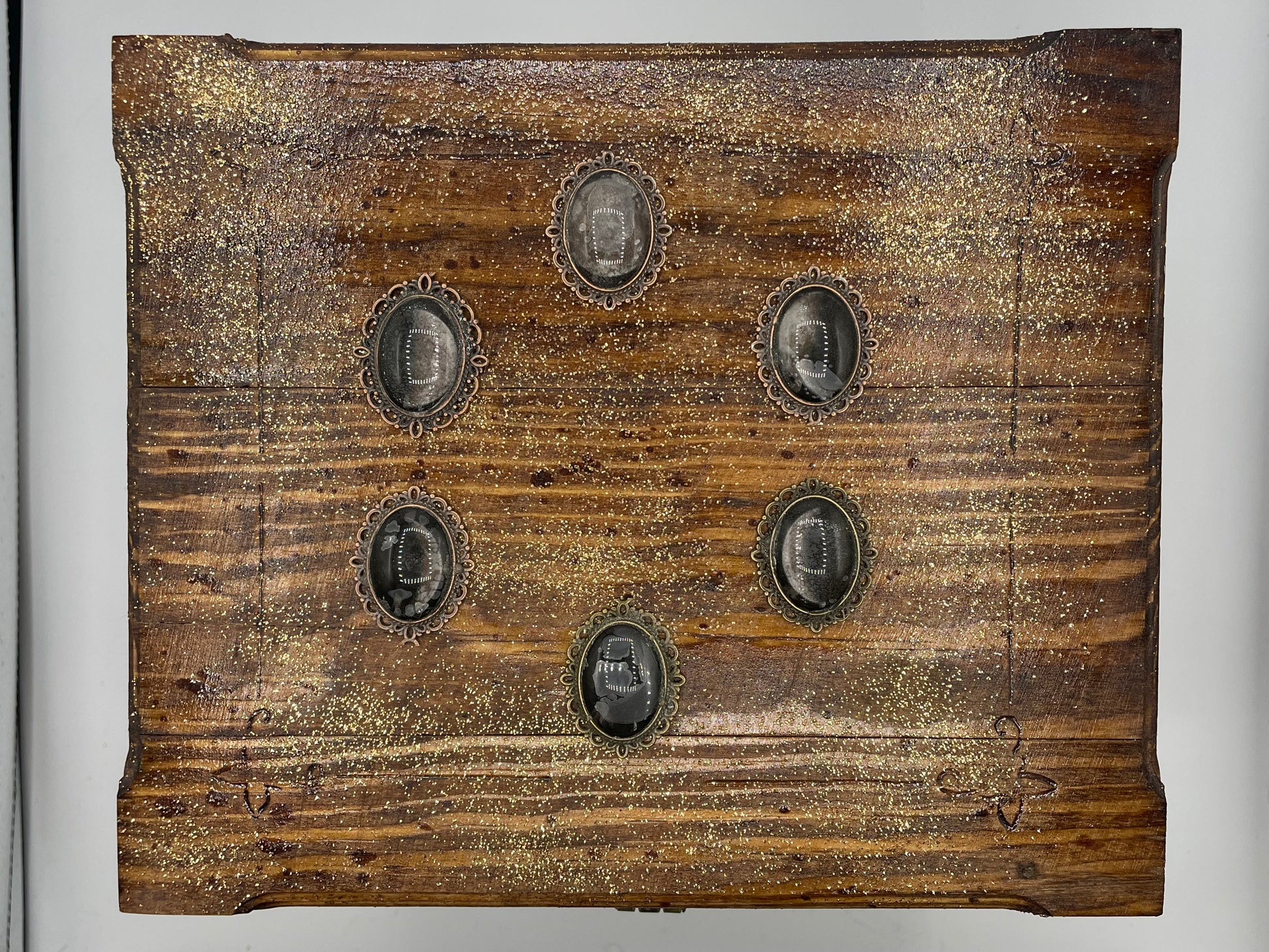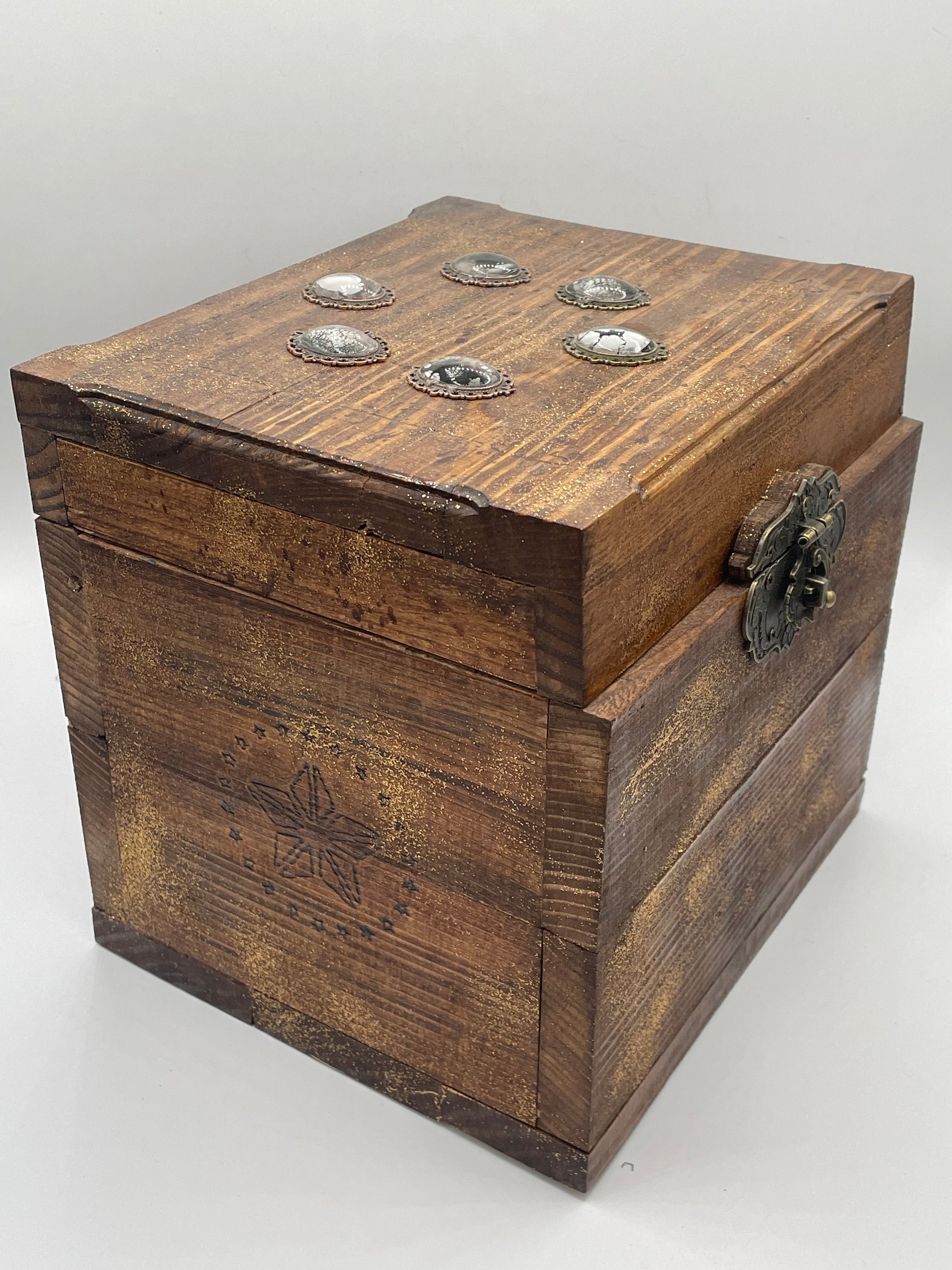 The moon phases box is a hand constructed, mysterious marvel. The entire box features beautiful wood burned designs and golden glittery staining. The lid is crowned with glass encased silhouettes representing the phases of the moon. The inside is lined with a soft red felt, and the hinges and front clasp are ornate bronze. This box measures 9" length, 8" width, & 8.5" height.