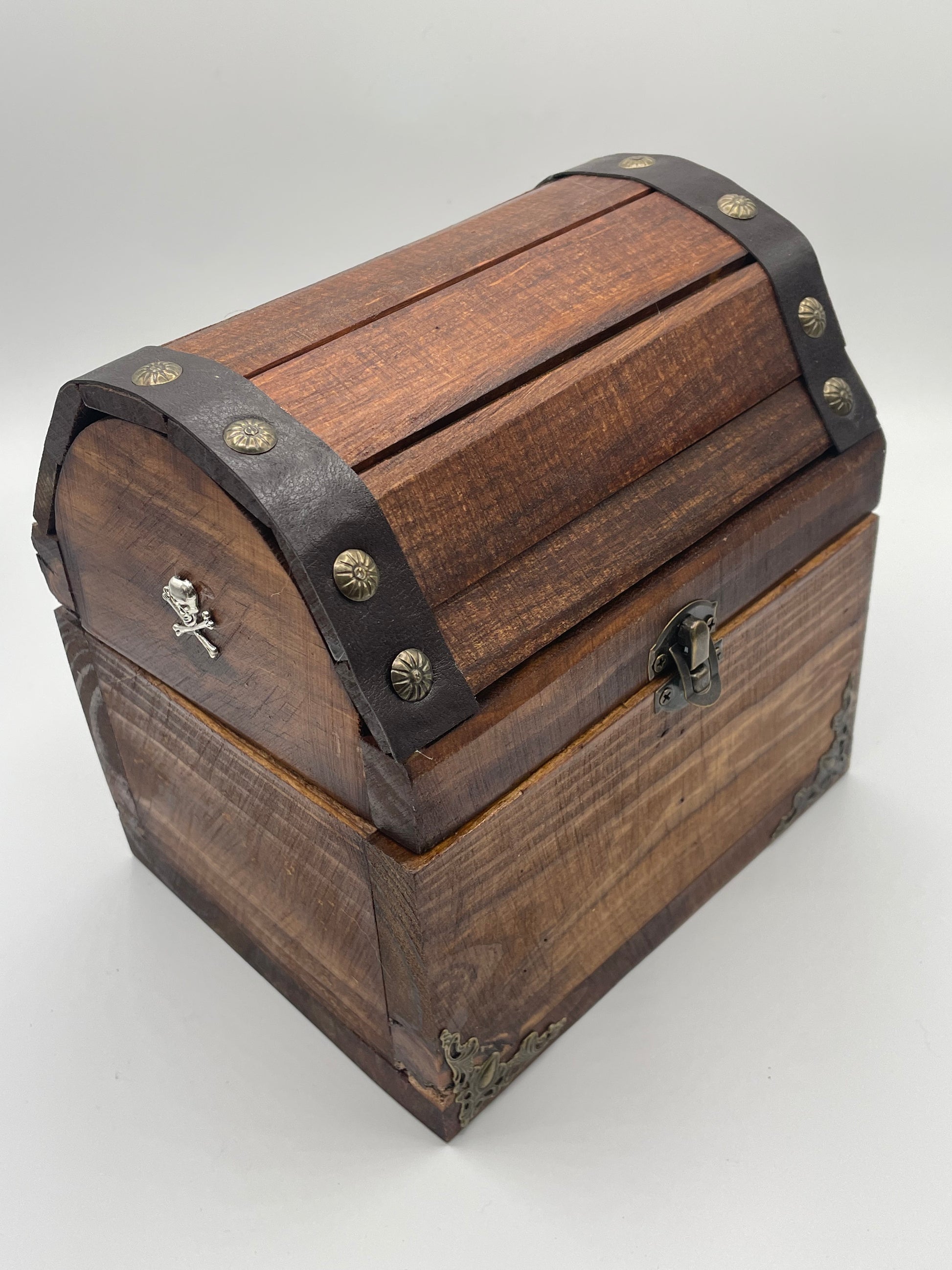 This adorable Pirate Treasure Chest measures about 7" length, 5.75" width, & 7" height. These chests are hand carved, stained, and constructed. The round top is accented with a faux leather wrap and adorned with bronze nail pins. the front has a bronze latch and the sides feature smalls silvery skull and cross bones.